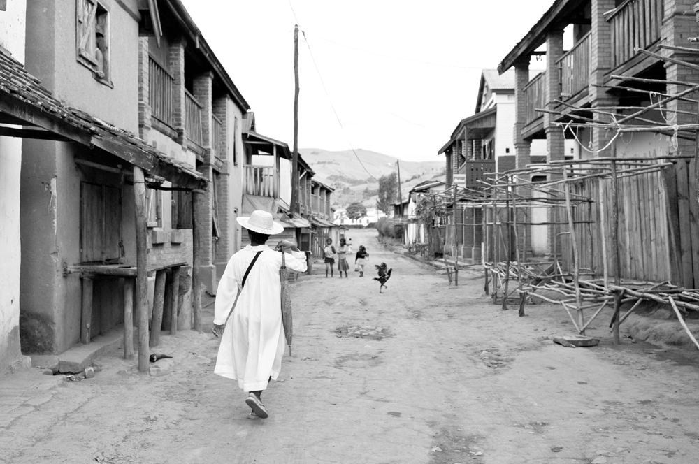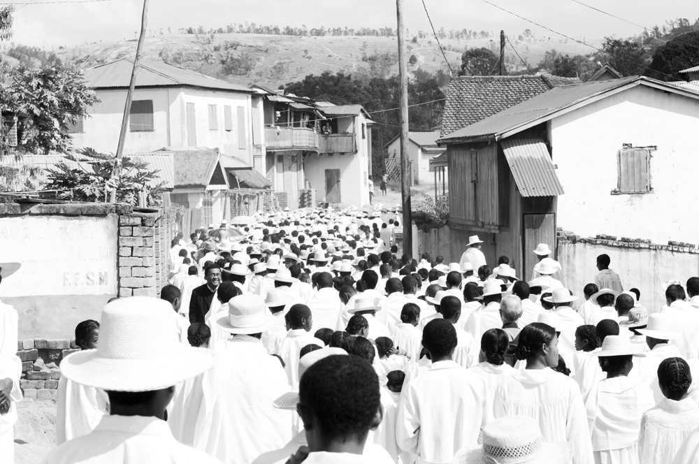 In the Highlands of Madagascar, suspended between Heaven and Earth, I discovered the isolated mountain village of Soatanana (Meaning beautiful city in Malagasy). Dressed in white as a sign of their purity , the residents like shepherds ‘ live according to the strict rules of their faith, an offshoot of Christianity steeped in spiritual revival. Like an army of singing angels, this unique community travel through the dusty main street to reach the beaten bare earth square at the foot of their large temple.