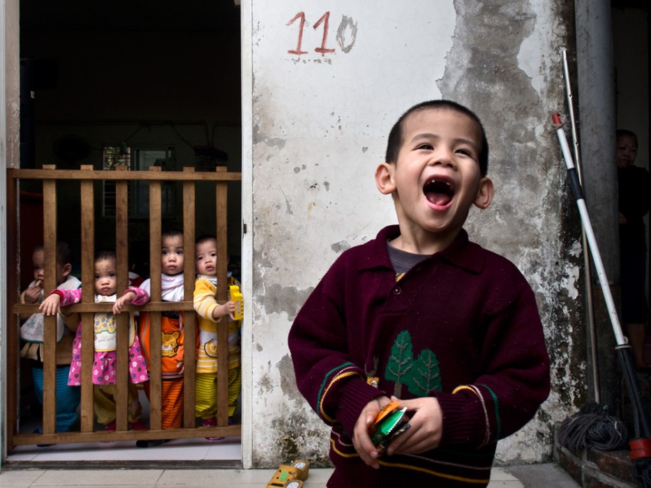 Group of children inside a Buddhist orphanage in the outskirts of Hanoi. These are children that were abandoned or left behind because of mental problems or physical disabilities. The Buddhist nuns take very good care of them even if the conditions are quite difficult.