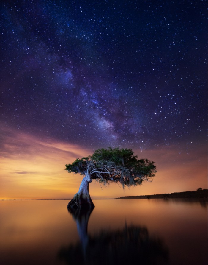 The Milky Way rises over a lone cypress growing in a lake in Florida.