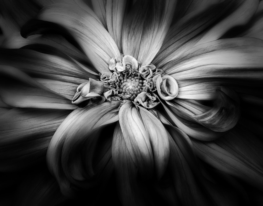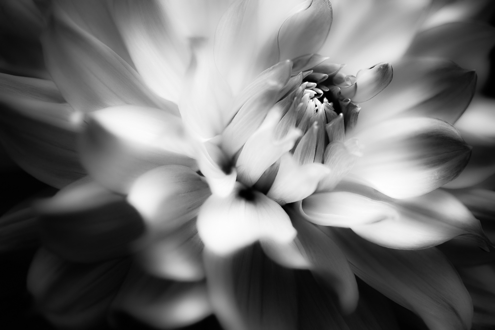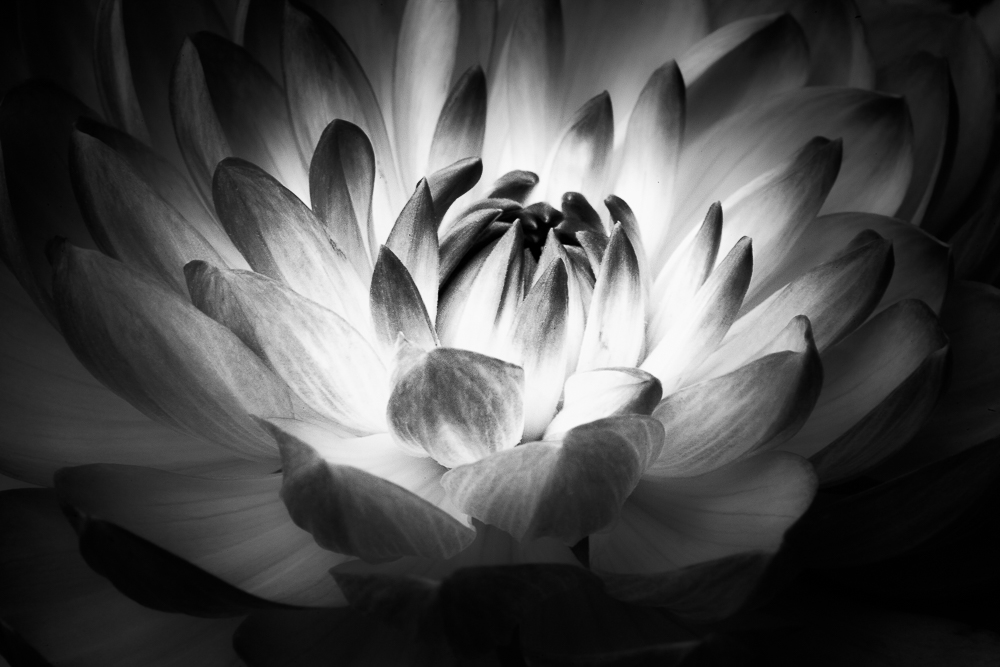 The Dahlia a highly prized flower grown and cross bred by enthusiasts all across the country in numerous cultivars. While having some of the most intense and stunning colors, I wanted to explore the form of flowers and how light envelopes the texture and translates the intense colors to simple grayscale. Working in black and white and using selective focus allows me to find the essence of light the flow of the natural beauty of the Dahlia.