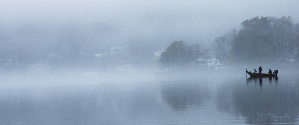 Lake Hopatcong NJ, Nov 14, 2008. Lake hopatcong is the largest fresh water lake in NJ. I took this photo from my dock. Th fishing boat is 2 miles away. I took a telephoto shot and turned it into a wide angle 2 page spread.