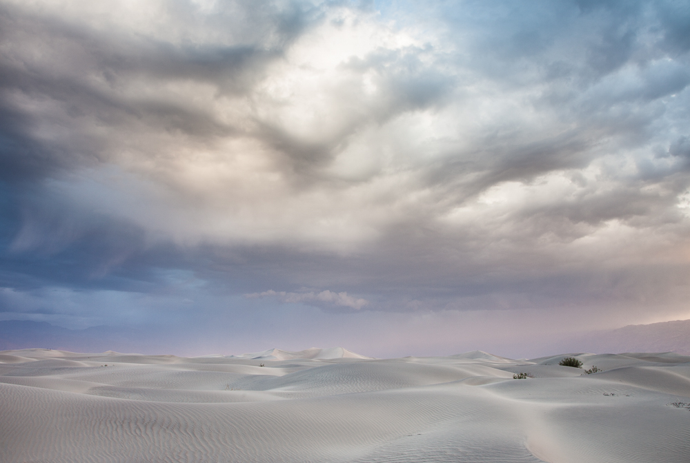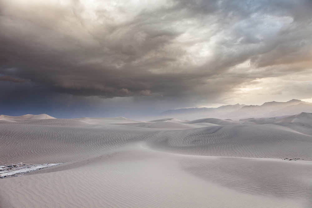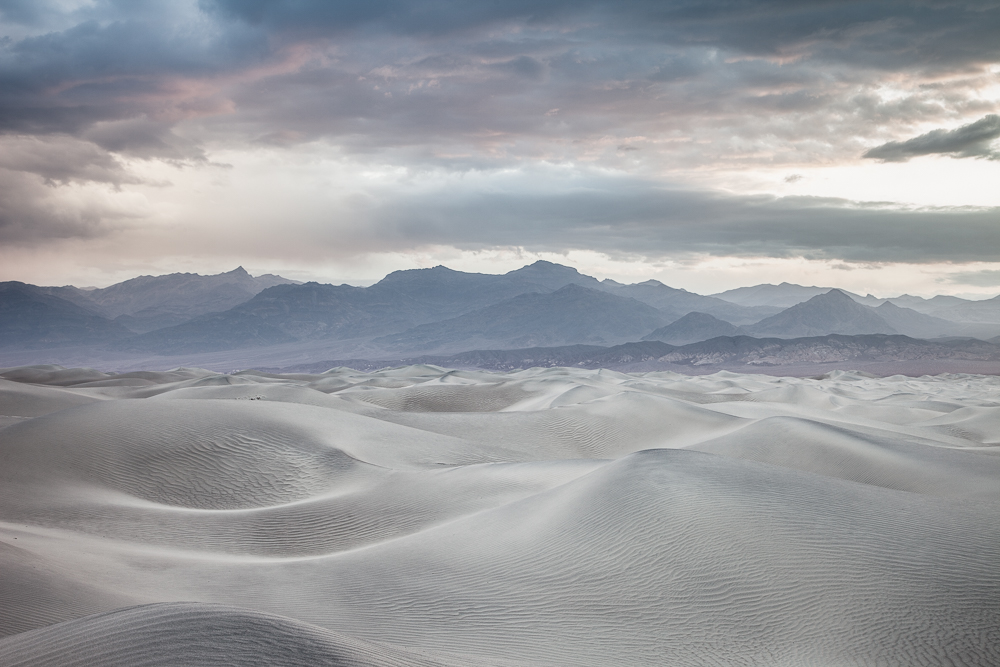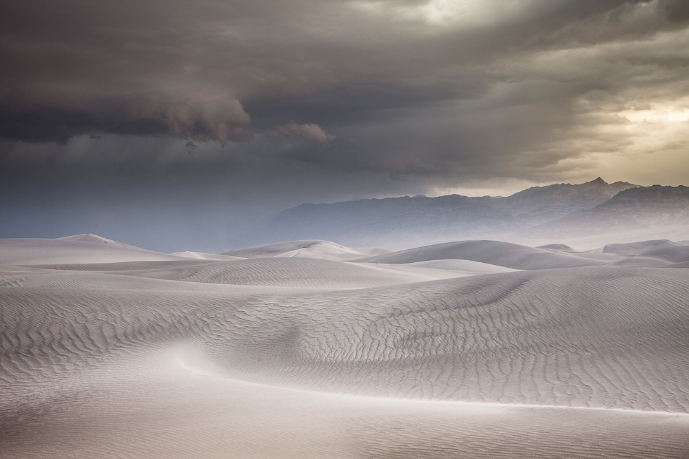 During a trip to photograph the high contrast dunes in Death Valley, I arrived to find clouds, rain and high winds for three days. Each morning I would head out to the dunes hoping to find some wonderful textured dunes. What actually transpired was three days of overcast skies, soft light and blowing sands. I don't normally shoot color, but each morning this really elegant soft light with a warm glow of tones would rise to east. Hopefully these images express the elegant light of these mornings.