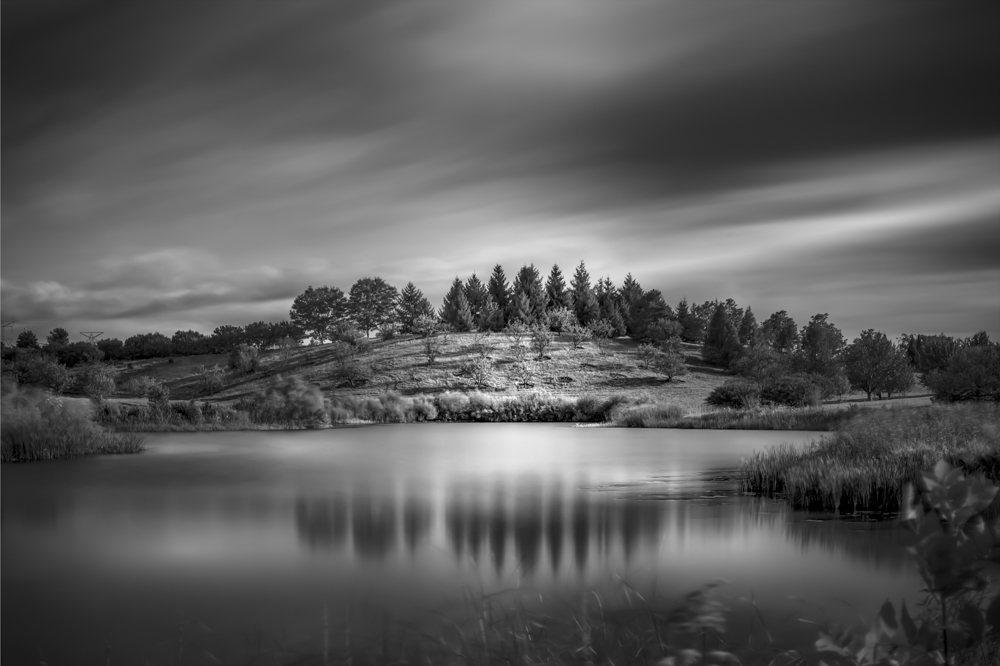 A nearby arboretum has a hill peppered with newly planted and meticulously maintained trees. This day their reflection in the water was slightly interrupted by wading geese enjoying the day.