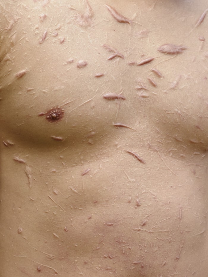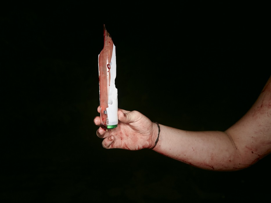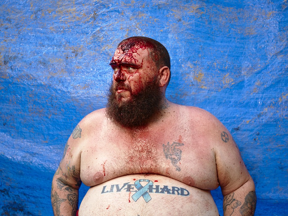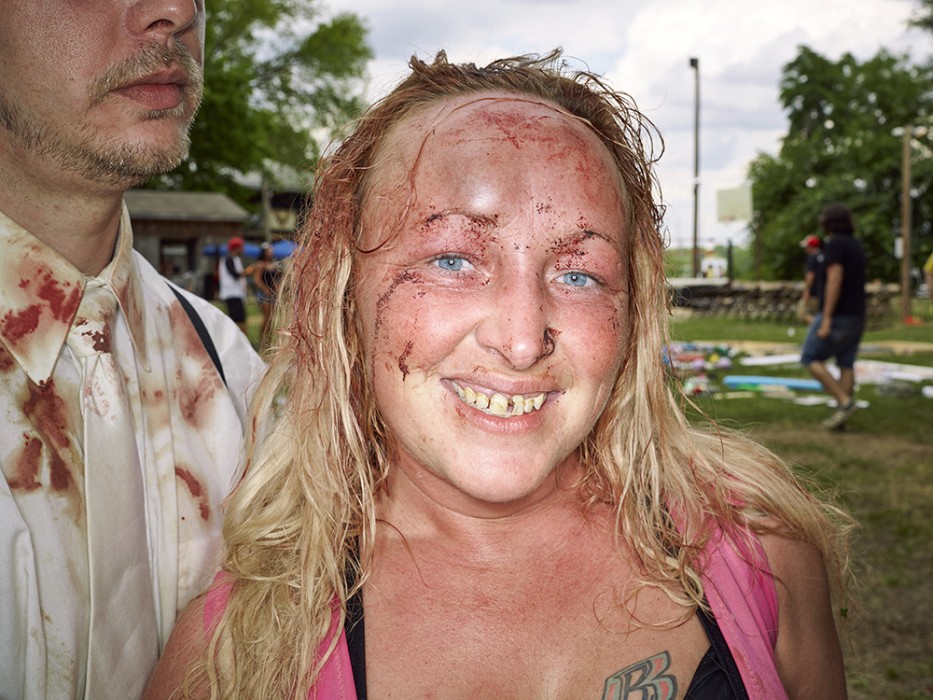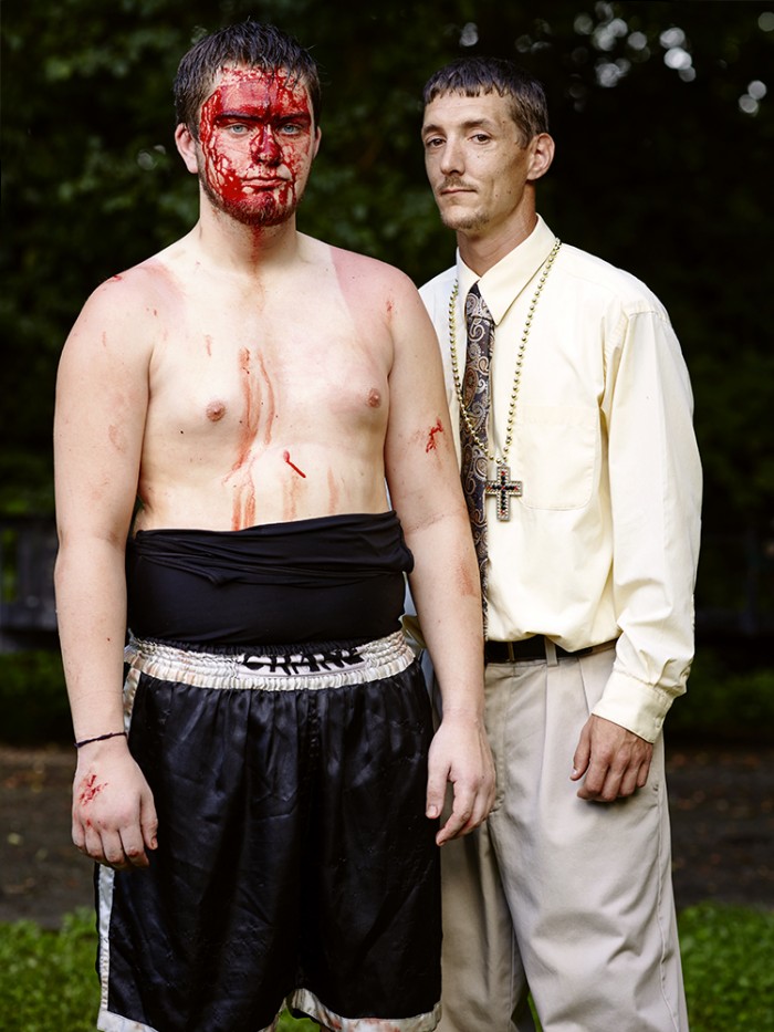 Professional wrestling is a huge part of American culture. The mix of athleticism and violent theater has more in common with Shakespearean Revenge Plays than actual sport. Dialogue recited before and after each match frame the character development of the “Faces” and “Heels” while the performance of sport uses practiced and choreographed stunts to create the illusion of combat. The 1950’s saw the introduction of blood as a theatrical element which crossed many lines of social taboos but at the same time boosted audience levels to new heights and began what is now known as hardcore wrestling. Today, independent promotions specializing in Ultraviolence and Death Matches go in search of audiences performing in fields, social clubs and carnival like events with ever increasing levels of violence. Crowds of sunburnt men, women and young children crowd close to the ring as every fall into barbed wire and every broken pane of glass elicits gasps and eventual cheers when the wrestlers present their injuries to the spectators. In a very extreme way the theatrical self mutilation for the crowd’s enjoyment highlights our attraction as a society to violence and questions where entertainment ends and our taboos begin. American Ultraviolence is a series of portraits of the wrestlers and fans of this niche of choreographed violence.