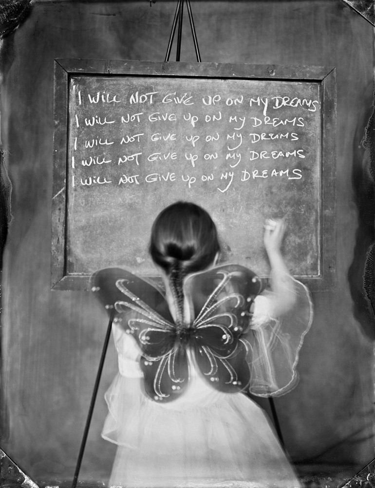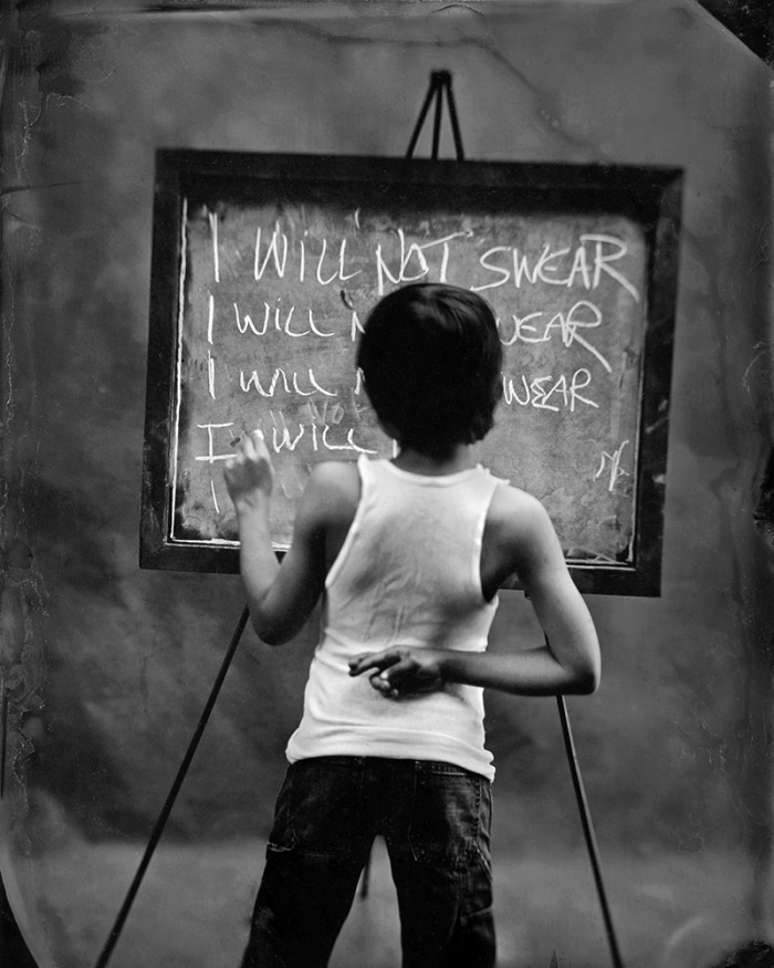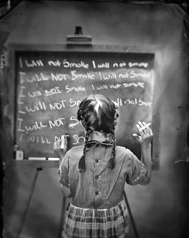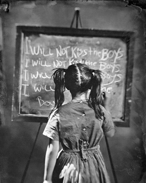 The world we live it today with digital cameras and I phones, everyone is a photographer, I find that photography is losing its artistic vision and beauty. As a photographer and a photography collector-I often find myself obsessed with old cameras and old technics I like to challenge myself trying new cameras and new ideas using the amazing history of photography. I find myself using my digital camera only for work these days and working strictly with vintage cameras and film. This series “Vices” was photographed with a wet plate collodion process that I feel illustrated the magical innocence of youth alongside the darker recesses of human nature. A vintage perspective on childhood, punishments with a little humor.