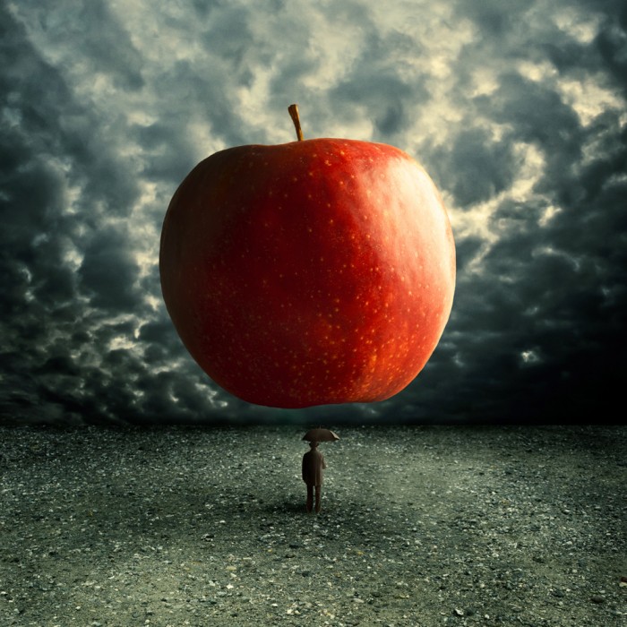 This surreal image is obviously inspired by Rene' Magritte, an artist whose works I adore. It has some relationships with psyche, is highly dreamlike and provide a vision of what could happen in a dream or maybe a nightmare. We cannot see the face of the man with the umbrella, is it me? Or is it you, the viewer? Is this my dream or yours? The title of this work: "The weight of the dilemma" is not what it seems. What is it the dilemma for the man with the umbrella? Or is it a dilemma of the artist? Or for the viewer, that cannot decide what represent this image?