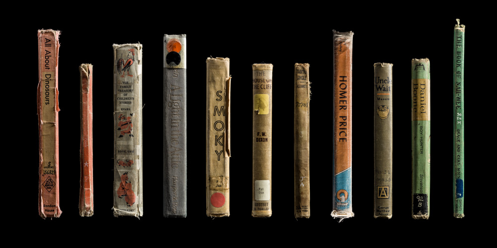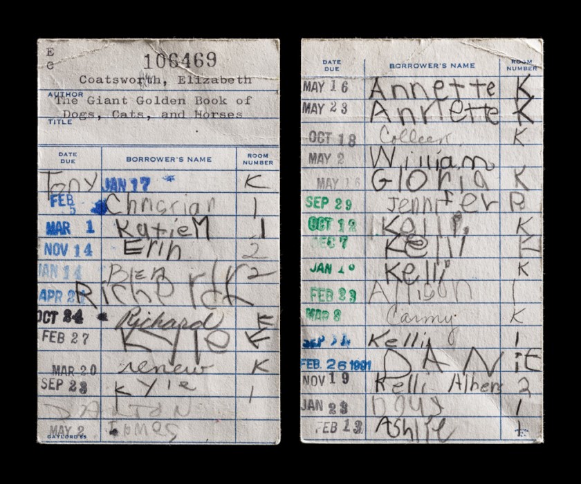 The first rite of passage upon learning how to write one’s name was to inscribe it on a library check-out card promising the book’s safe journey and return. I remember reading the list of names that had come before me and feeling that I was a part of this book’s history and it’s shared, communal experience exposed by curly-Q handwritten names revealing repeat customers devouring the book beyond it’s deadline. An act of declaration that’s dissolving faster than we can see as cards are removed permanently and bar codes take their place. The Japanese term “wabi-sabi” is described as the art of finding beauty in imperfection and of accepting the natural cycle of growth, decay and death. Unlike the American culture focused on spectacle, wabi-sabi is underplayed and modest, the kind of undeclared beauty waiting patiently to be discovered. It’s found in time-worn faces of expired library books that have traveled through many hands, and across county lines until they have reached their final resting place at ex-library warehouses where safe harbors are found in Costco-sized rows of “discards” rising within inches of the ceiling. Each picture serves as an homage calling out palpable echoes etched into the pages by a margin-scrawled note or a yellowed coffee splatter. They show the evidence of everyone that has touched them, because they were well read and well loved. Now they have a new life, as portraits of a unique shared experience found only in a library book. We must take time to celebrate the swiftly disappearing, unique communal experience offered by library books as it’s quickly replaced by downloads and finger swipes. If you listen carefully you can hear the aching poetry calling from tattered pages that carry the burden of their years with dignity and grace.