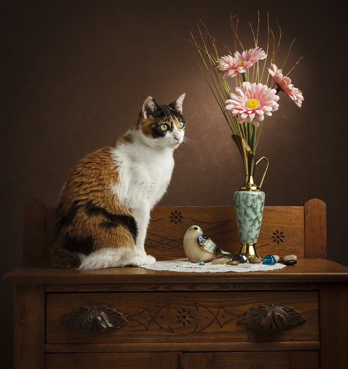 In the influence of old master paintings this image was done with a antique dresser and vase to reflect a bit of the past in a studio set up. My cat Kumi was happy to be part of it.