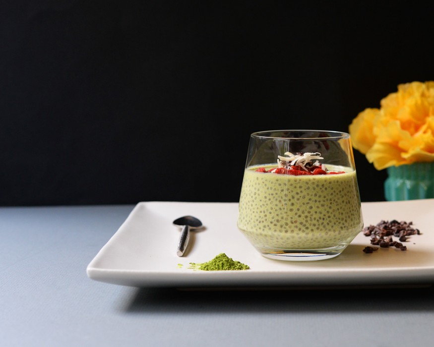 This is a still life image of a Chia seeds pudding of coconut milk mixed with green tea matcha, topped with goji berries, coconut flakes and cacao nibs. It was taken under the natural light of the window by my dining room table.
