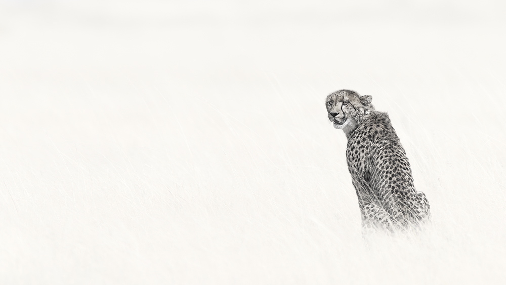 Cheetah (Acinoyx Jubatus) sitting in high grassland. This Cheetah was waiting for her siblings to catch up. Three Cheetahs were stalking a Springbok herd in Etosha National Park, Namibia.