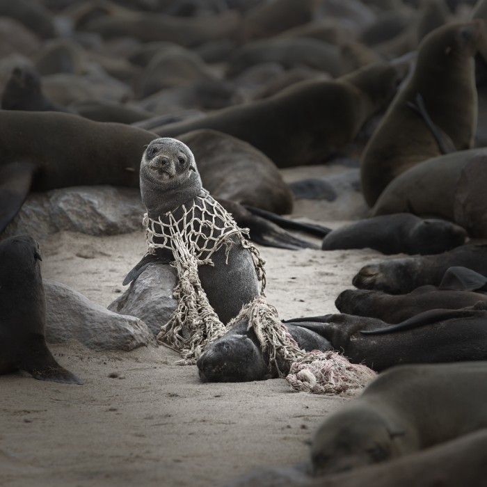 Brown fur seal cub (Arctocephalus Pusillus) also known as Cape fur seal. The seal cub has become entangled in a piece of fishing net, probably at sea. Cape Corss, Skeleton Coast, Namibia. IUCN list Least Concern.