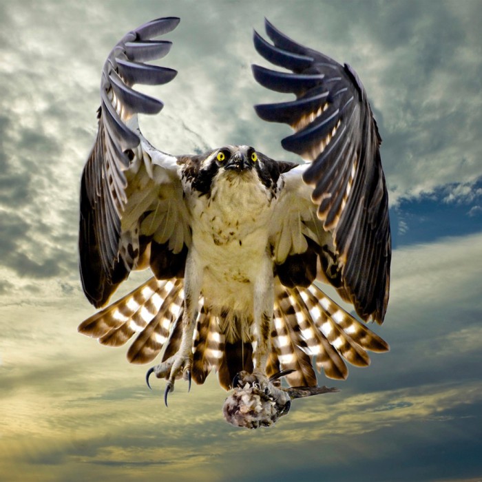 I know this osprey quite well. This osprey has made his nest with his mate in the same spot in a very large county park in St. Petersburg, FL adjacent to a parking lot where I often park when I do a training session on my bike. The regulars call him “Fleck” due to a fleck at the 7 o’clock position of his right eye. I often photograph him and on this day, I was photographing an owls nest about a mile away and stopped by to see if their was any action at the osprey nest. I found him sitting on a power line with a fish and knowing that he is uncomfortable around people and other birds when he has caught a fish, I readied my camera for action. He did not disappoint and took off towards his adjacent nest and I started firing my camera. I filmed a complete sequence in which the bird landed on the nest and fed the fish to his waiting mate which the locals have named Jewel. When I got home and was uploading my images, I almost fell off my chair when I saw that I had made this amazing capture of the bird with his wings in the so-called angel wing position, making direct eye contact t with me and clutching a fish in one talon - a one in a million capture!!