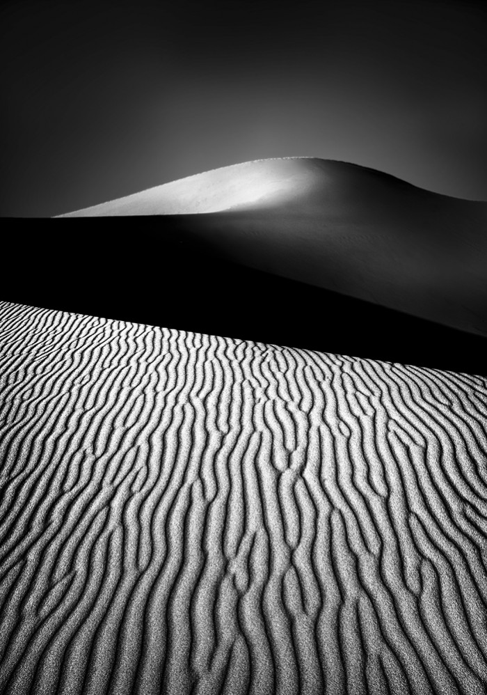 At first light the glancing rays of the sun highlight the curves of a sand dune.