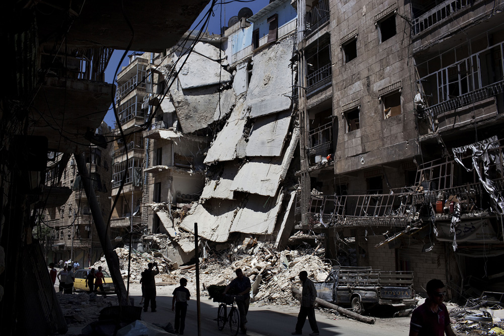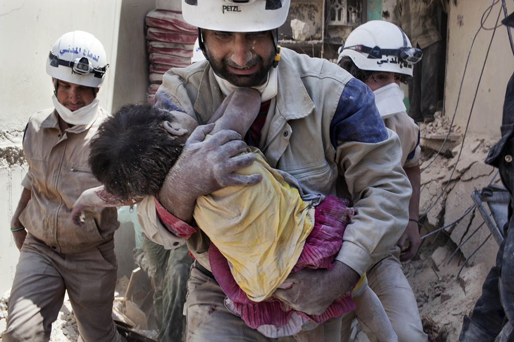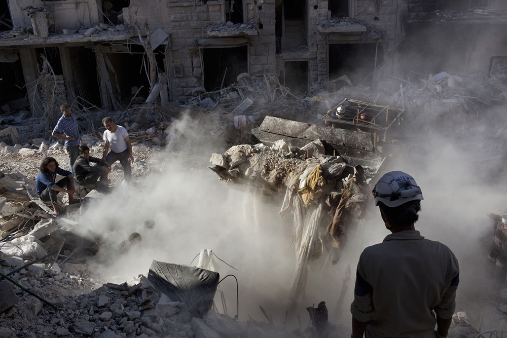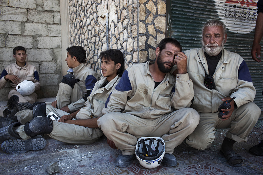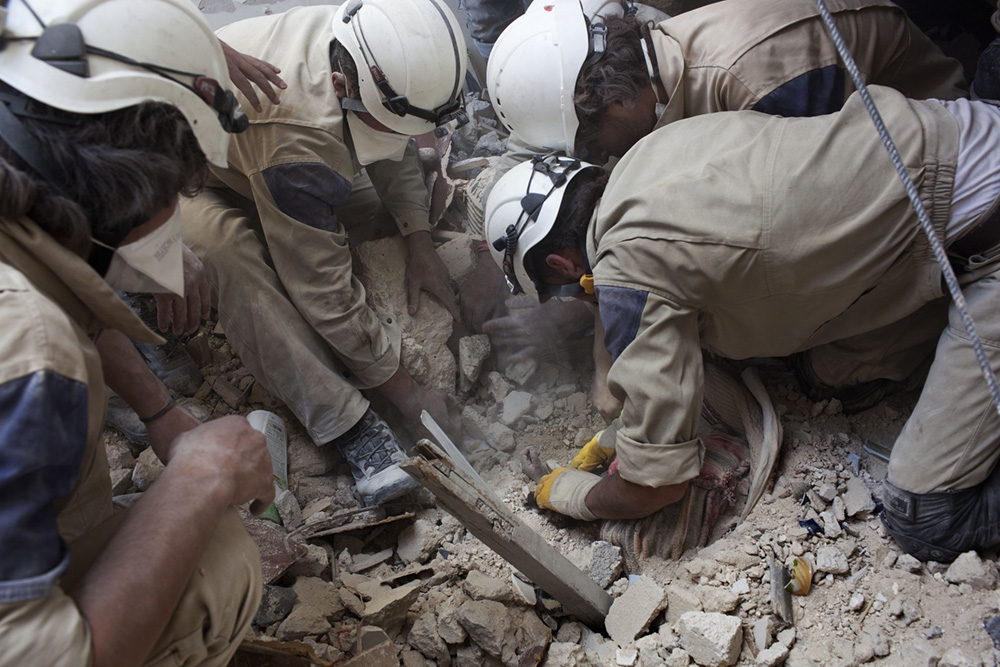 The new death threat in Aleppo comes from the sky in the shape of barrels full of TNT. They are launched from helicopters of the regime and they can reduce a building of five floors to rubble and dust. These “home-made bombs” are cheaper than a missile or a conventional rocket but their destructive power is much higher. With a daily average of more than 25 barrel bombs, the city of Aleppo pays the price for so much cruelty and destruction with collapsed buildings, debris and casualties. One day Al-Assad’s Army destroyed a whole block with a Scud missile in the neighborhood of Ard Al-Hamra killing a lot of people trapped under rubble because there wasn’t any specialized rescue team. That day The White Helmets were created with the aim of being the first ones to arrive and save as many lives as possible. Since then 135 people work in shifts of 24 hours 7 days a week in five different places inside the city of Aleppo. Equipments are given by a British NGO but they are not enough, sometimes it took them more than one week to recover all the bodies under the rubble because it is something almost impossible to do with the tools they have, even so they continue on the front line trying to save as many lives as possible although the number of lost souls is higher. The dramatic situation in Aleppo remains silenced. There is no interest in telling what happens here, Syria is not trendy.