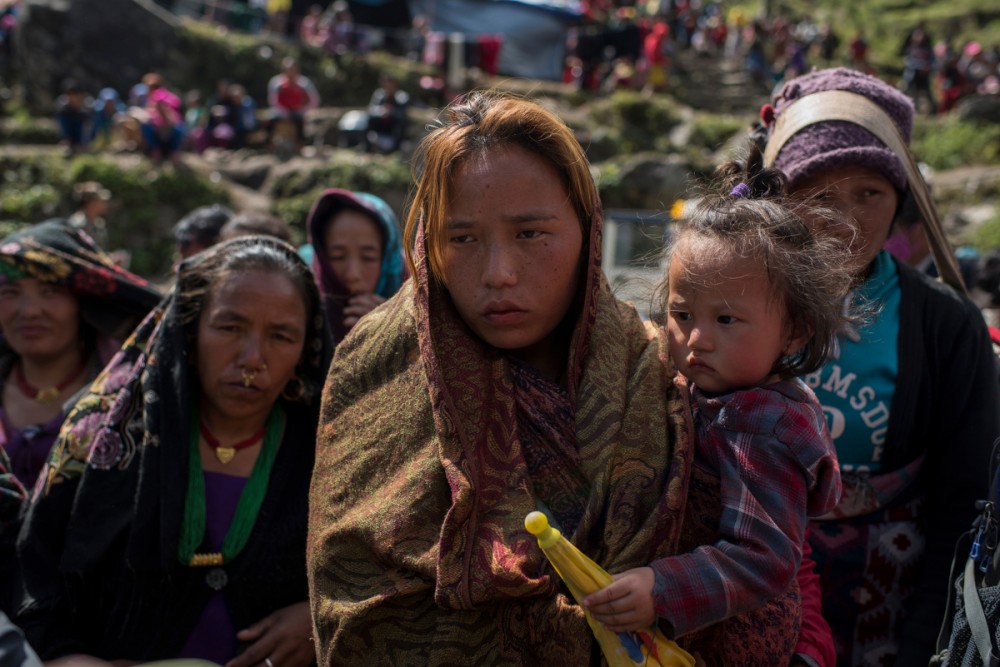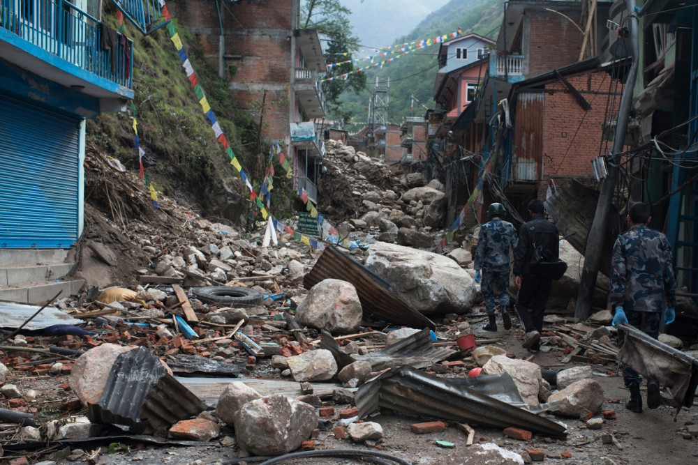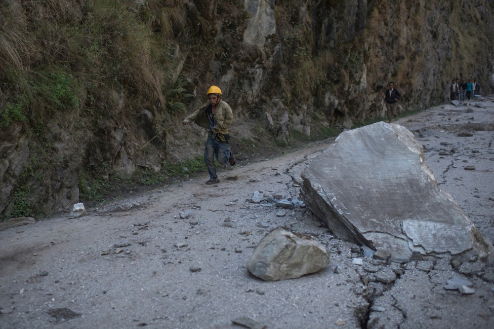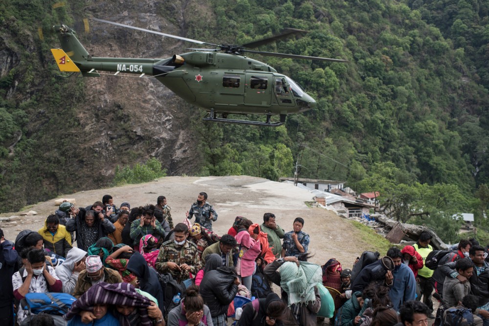 On 27th april a second earthquake of 6.5 magnitude stroke at 17 km south of Kodari on the Nepali Tibet border. Massive landslides definitely destroyed the already damage Araniko Highway which is connecting Kathmandu to the Sino Nepal border. A week after the natural disaster 1500 people where still isolated in the small village of Kodari where they are surviving by sleeping in an improvised shelters. Chilly temperature at night and uncertain future on when will be possible to live the dangerous area had an heavy toll to the local population. Few helicopters from the Nepal army transferred from 12 to 40 people a day to a saver places, the small number of passenger por trip created caos an hunger between the people that wait every day for a lift. The most adventurous people decided to walk down to the valley for the 12 km dangerous stretch that connect Kodari to Barabise where was possible to travel by bus to the capital.