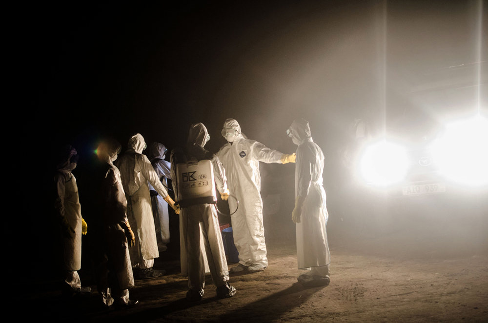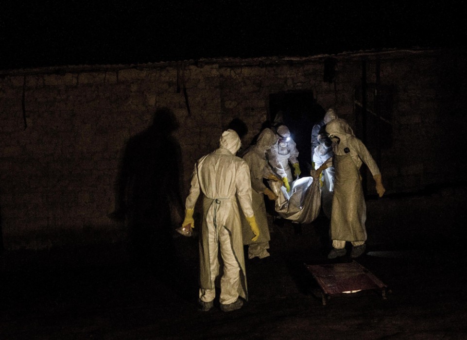 With Ebola raging in Sierra Leone, the role of dedicated burial teams is key to stopping the spread of the virus. The body is at its most contagious after death and a single unsafe burial can infect dozens. After a long day's work this team was called in to collect a suspected Ebola victim from the village of Pendembu, in the forested east of Sierra Leone. They felt they could not leave it until the morning, so ended up performing the dangerous task of disinfecting and removing the body using only flash lights.