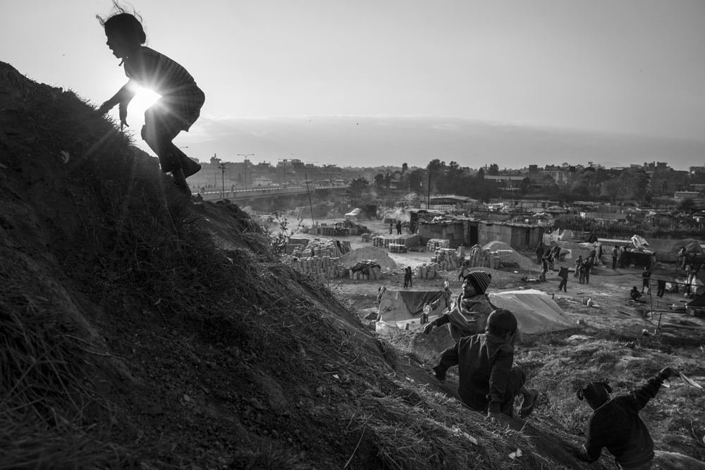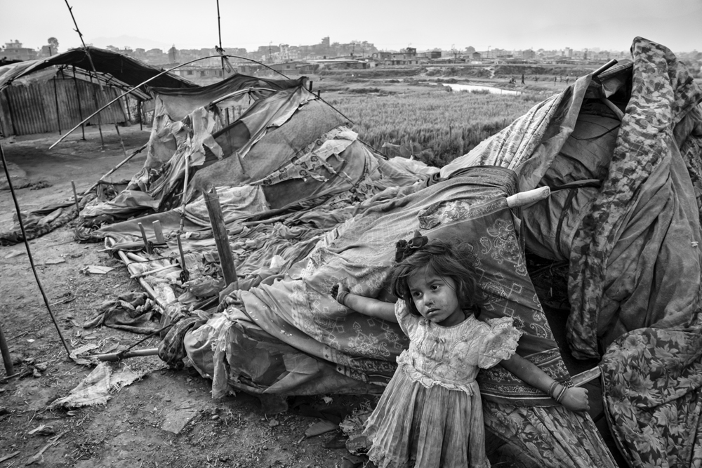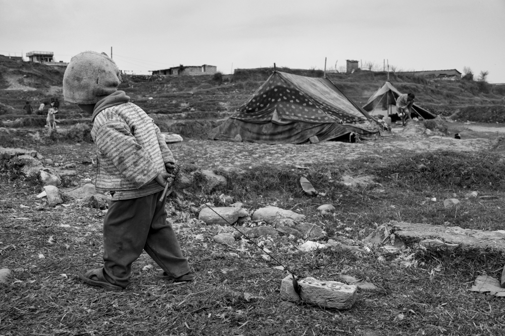 Sakina, Sandesh and their buddies live in tents on waste grounds. They are children of itinerant families who come from the Tarai plains and wander in the central valleys of Nepal, between urban and rural areas. Every day, these little nomads are left to themselves in the camp, unprotected, while their parents seek means of survival in the cities. They have no schooling and hang around aimlessly, torn between the joys and the limits of their freedom. The camp surroundings are for them a playground, a place for explorations but also for boredom. Brave and big-hearted, they are remarkably resourceful. They make games out of nothing and support each other through the good and the bad times. By nightfall, they wait eagerly for their parents, who return with relief. For three years, I have followed the path of these families in seven successive camps. After the earthquake struck Nepal on April 25, 2015, I visited them again. Although some children and adults got injured and went to hospital, all survived the earthquake and its aftershocks. However, their life of vagrancy has become more fragile than ever.