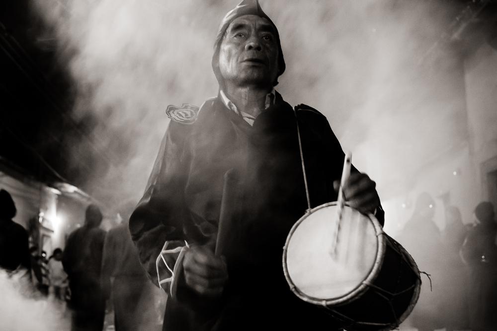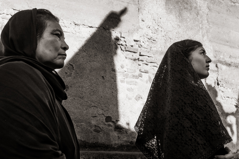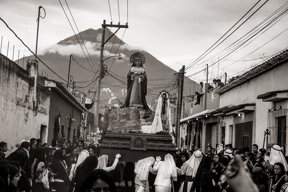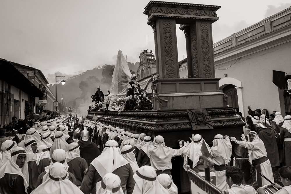 The burden and beauty of belief weighs heavy on the shoulders of the faithful as they perform the age-old traditions of Holy Week that were brought from Spain to Guatemala in the 17th Century. Throughout the week, the brotherhoods of the churches in and around Antigua partake in solemn processions that commemorate the last days of Jesus. A thick veil of smoke from incense burners fills the air, and the mournful sounds of funeral dirges from brass bands echo off ancient monastery walls, as the spectacular processions slowly wend their way through the narrow cobblestone streets and over decorative carpets (alfumbras) of pine needles, flowers, fruit and colored sawdust. Scores of men dressed in biblical garb carry elaborately carved antique wooden platforms (andas) featuring sacred statues of Jesus, while hundreds more walk alongside awaiting their turn. The anda is never set down, and as it sways back and forth while the procession slowly inches forward, it seems as though it might topple over at any moment. In a similar fashion, andas with statues of the Virgin Mary are carried by doleful women, dressed in black or white lace. Both the statues of Jesus and Mary, and the massive andas, which may weigh thousands of pounds, are centuries old. The processions can last over twelve hours, and often begin or end in the wee hours of the night. No written description can adequately convey the spirituality that permeates the atmosphere during these activities, but all those who witness the processions will certainly be touched. These photos, taken from Palm Sunday through Easter Sunday in 2015, provide a glimpse into the profound passion of Holy Week in Guatemala.