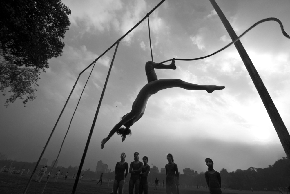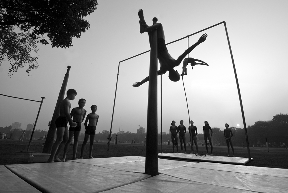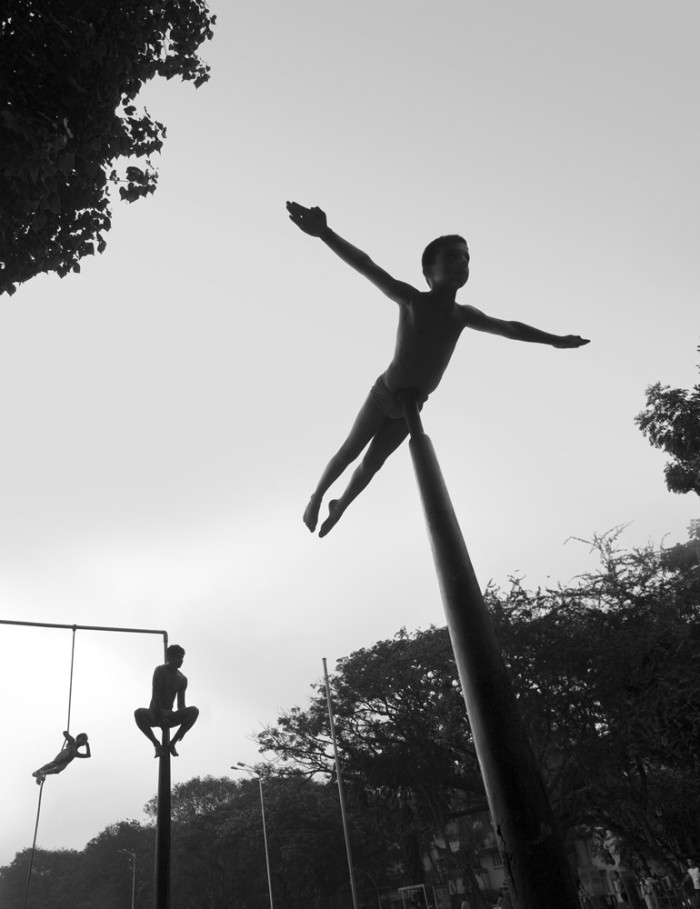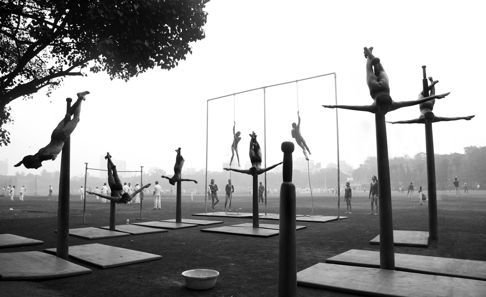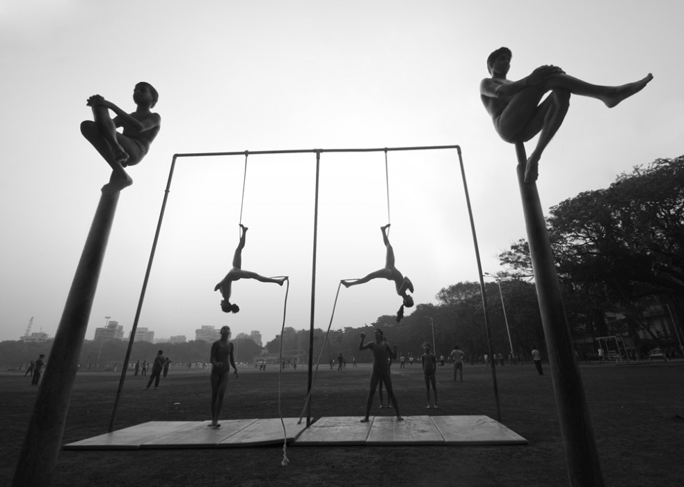 A series of journalistic candid black and white images taken for the ……….Udyan , on the grounds of Shivaji Park in Central Mumbai, India. This is one of the only institution of its kind that promotes this ancient sports form known all – “MALLAKHAMB ”, basically gymnastics done with the pole-“ Khamb ” and the rope “MALLA”. Have shot them to highlight the graphicness using black and white contrast.