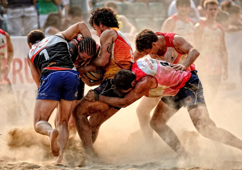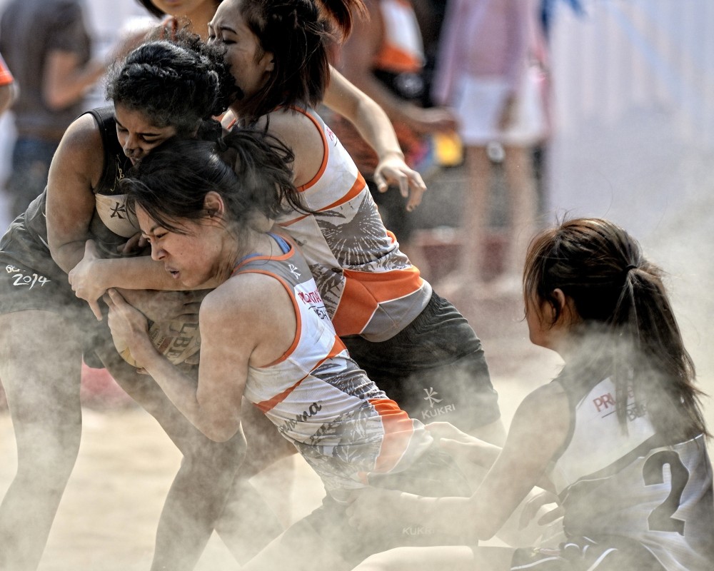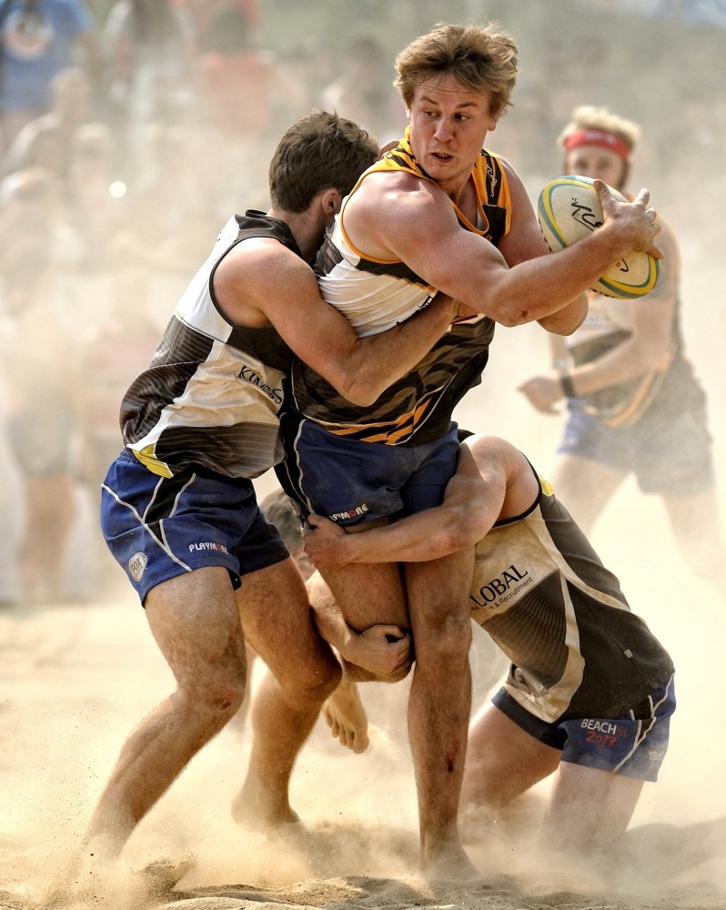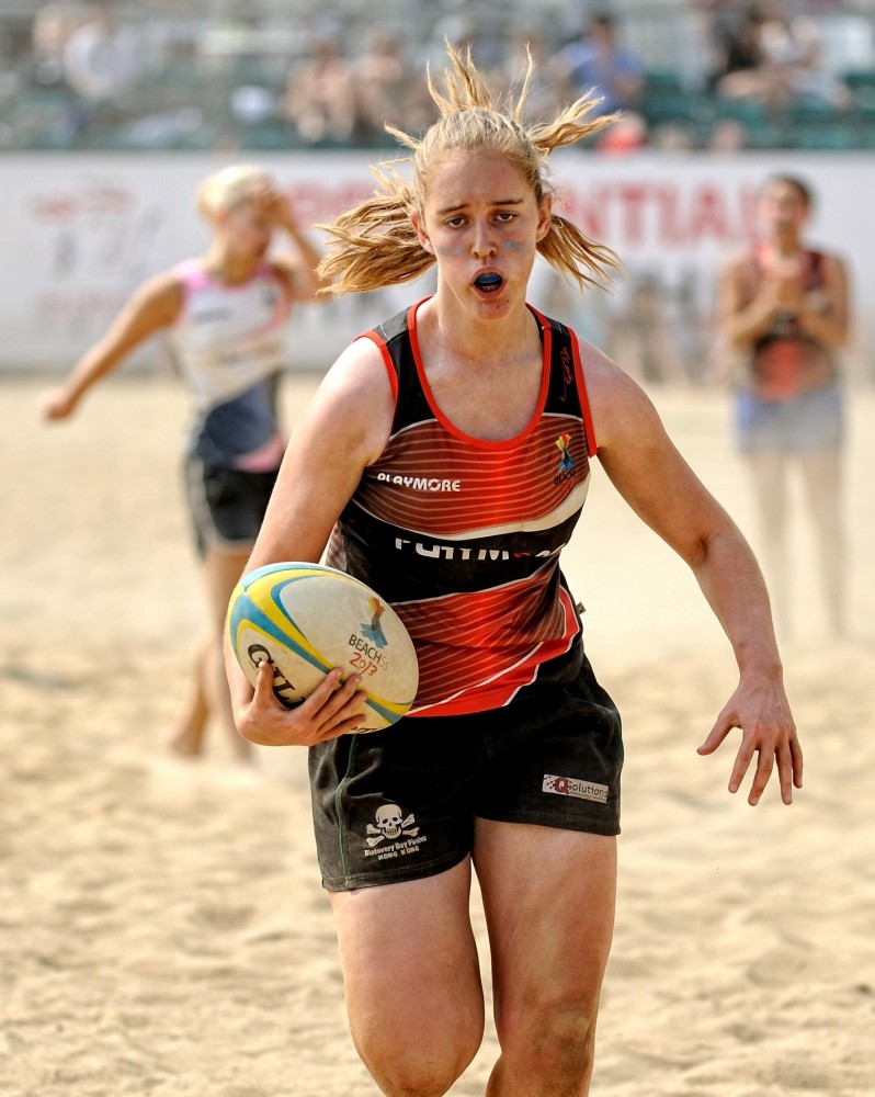 Beach Rugby is a sport based on rugby football codes. It plays on a field that is a fraction of the size of a standard rugby field, far fewer players (#5 as in the HK beach rugby tournament), shorter matches and a simplified scoring system. For spectators, they just enjoy the thrills and spills of rugby, nice tries, big hits and live music served up on the sand.