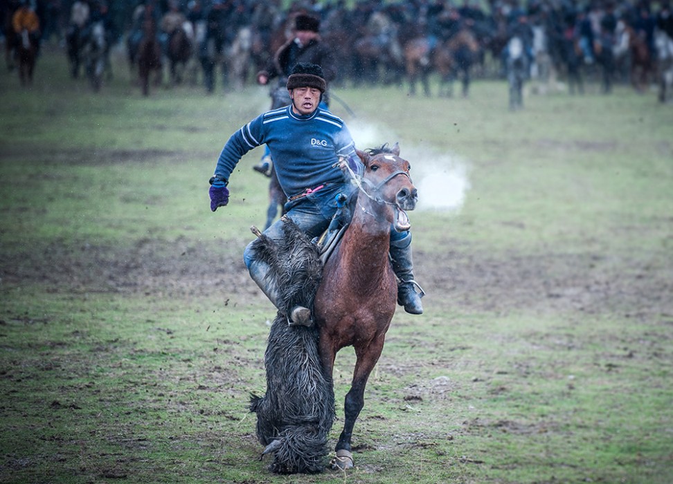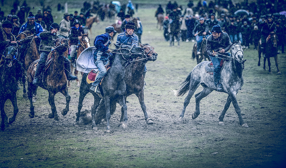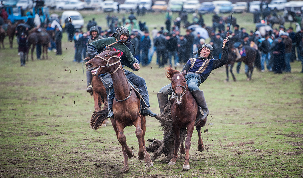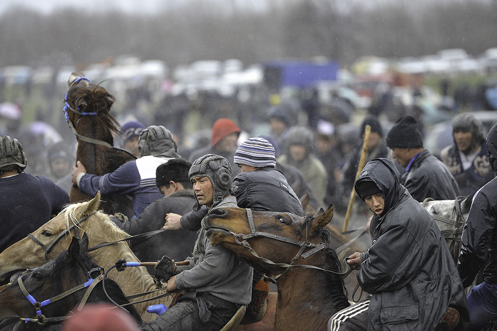 I was the only woman at this event held in a field a few hours outside of Samarqand, Uzbekistan. Ulak Tartysh is a popular game in this country and hundreds of men compete on horseback for a goat carcass. They then have to keep their opponents from taking the carcass and bring it to the end of the field where they get a prize. On a rainy/snowy day like this, the carcass supposedly weighed up to 80 kg. These men were competing to win some live goats that were with me in the dump truck that I scaled to take photos.