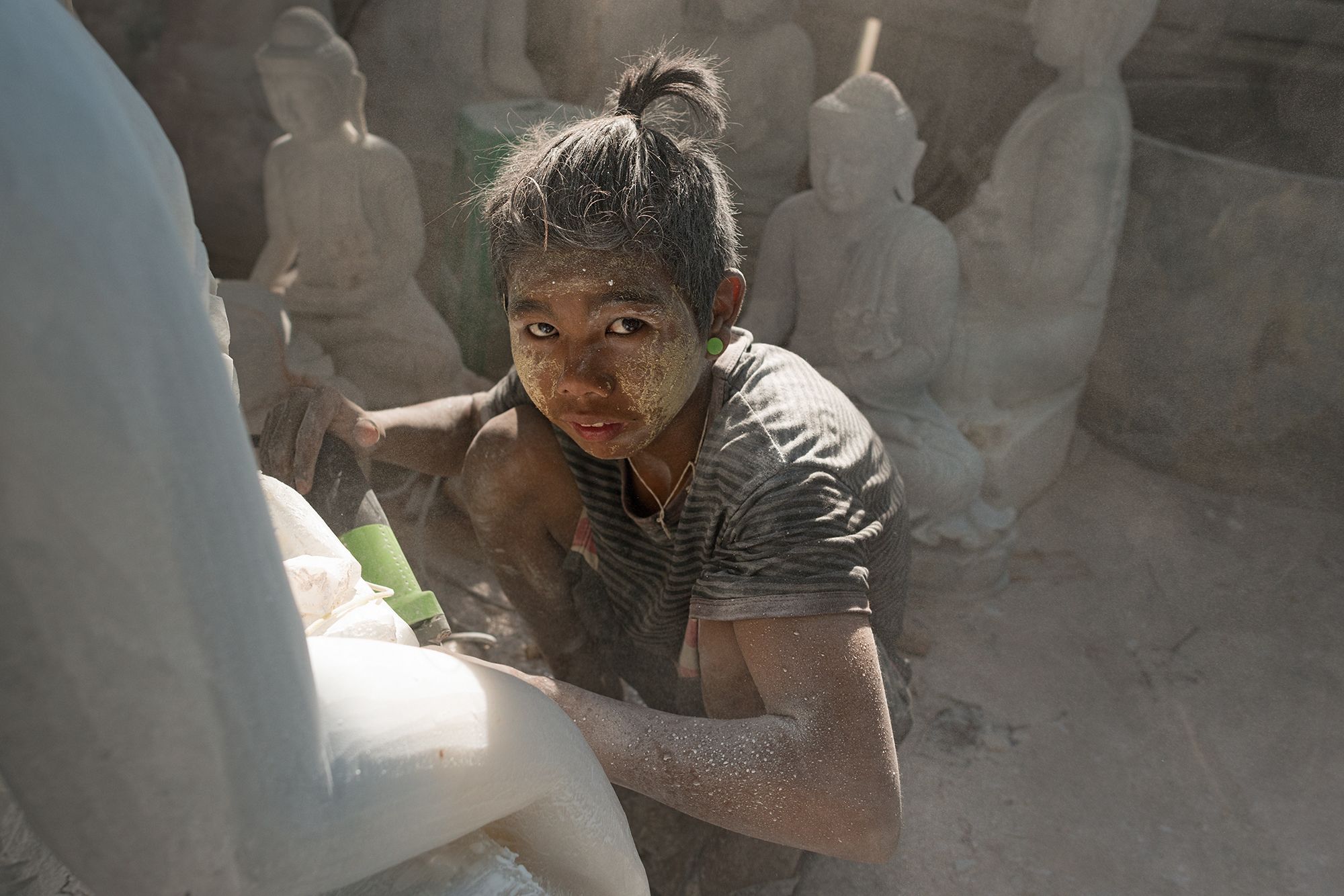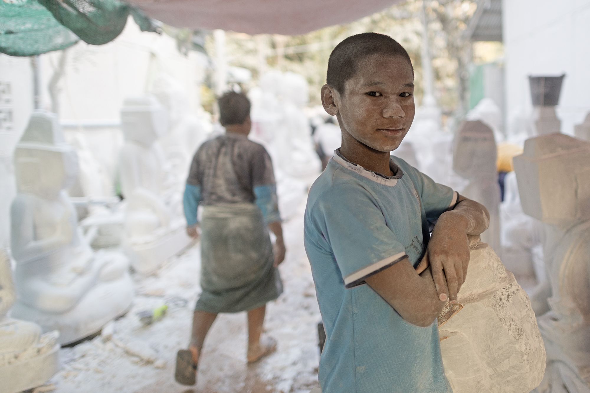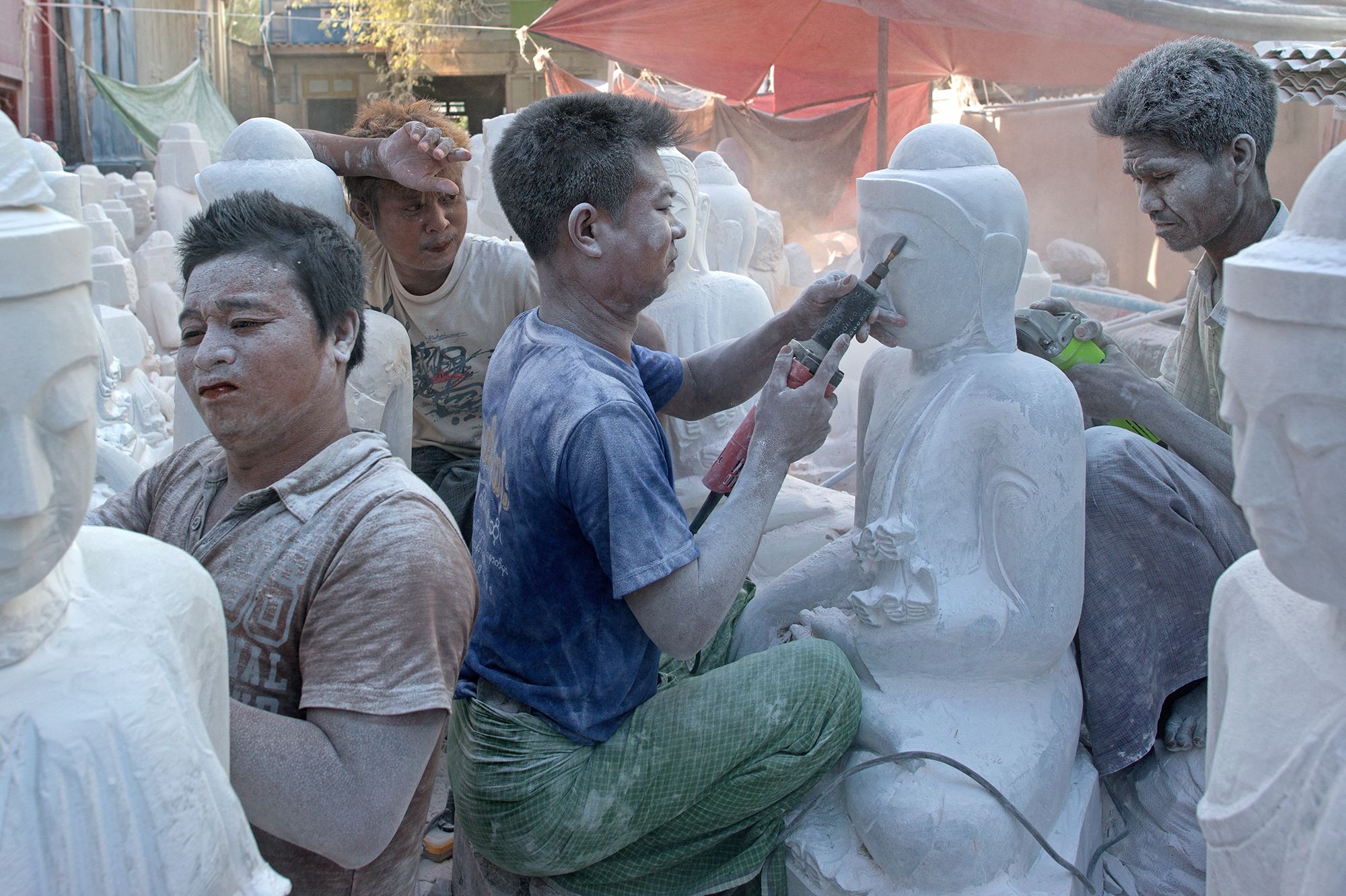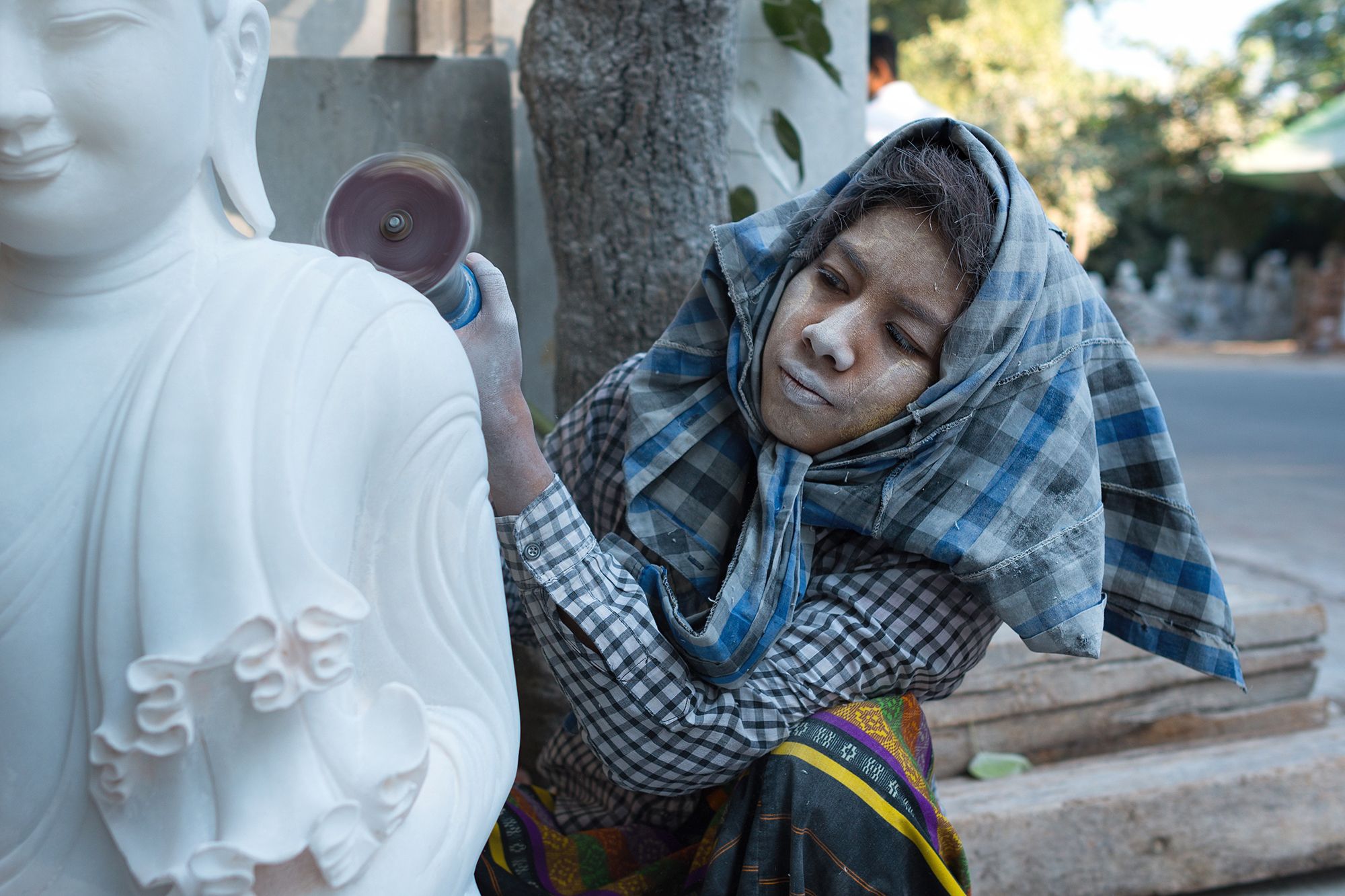 Near the Mahamuni Temple in Mandalay, Myanmar there are streets where stonemasons toil away on statues of Buddha. The working conditions in there are truly atrocious, with little respect for the health of workers or the environment. Work is carried out without protective masks or dust extraction systems. It is upsetting to see workers, especially children, working in such conditions – their faces caked with a crust of choking dust. The result of breathing in these concentrations of dust will surely result in lung disease and other respiratory ailments – practically guaranteeing an early death.