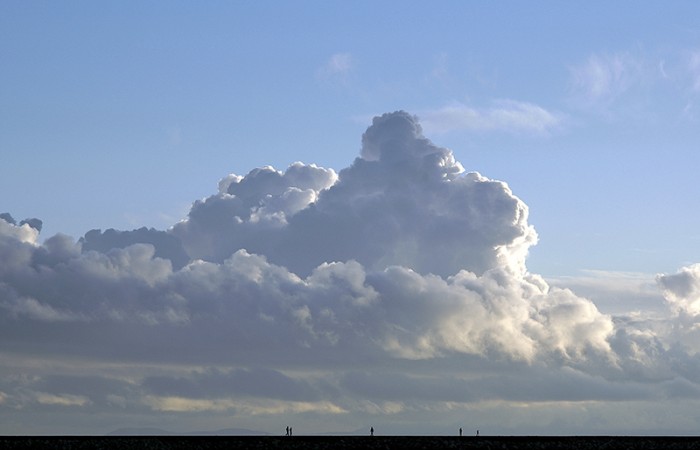 Three groups of people walk under the magnificent sky: a single person, a couple, and an adult with child. Three different ways of human relating, and the omnipresent relationship between Man and Nature.