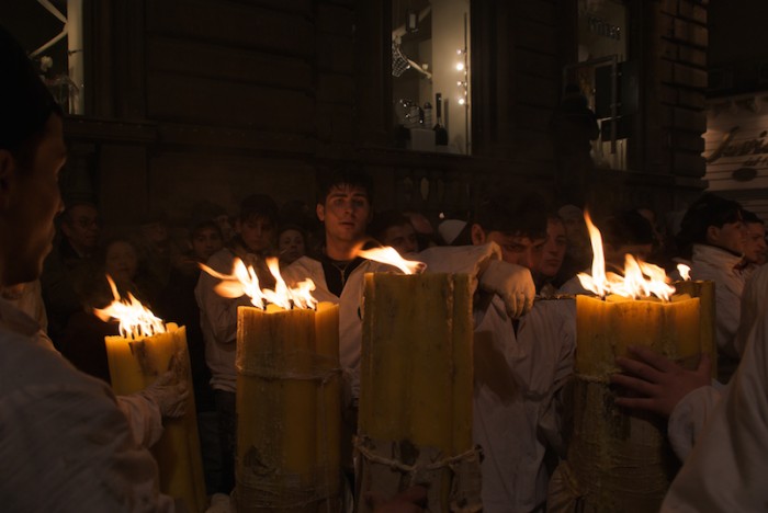 During the Sant'Agata celebration in Catania, devotees offer big candles to Sant'Agata. Faces in the dark, lighted by candles.