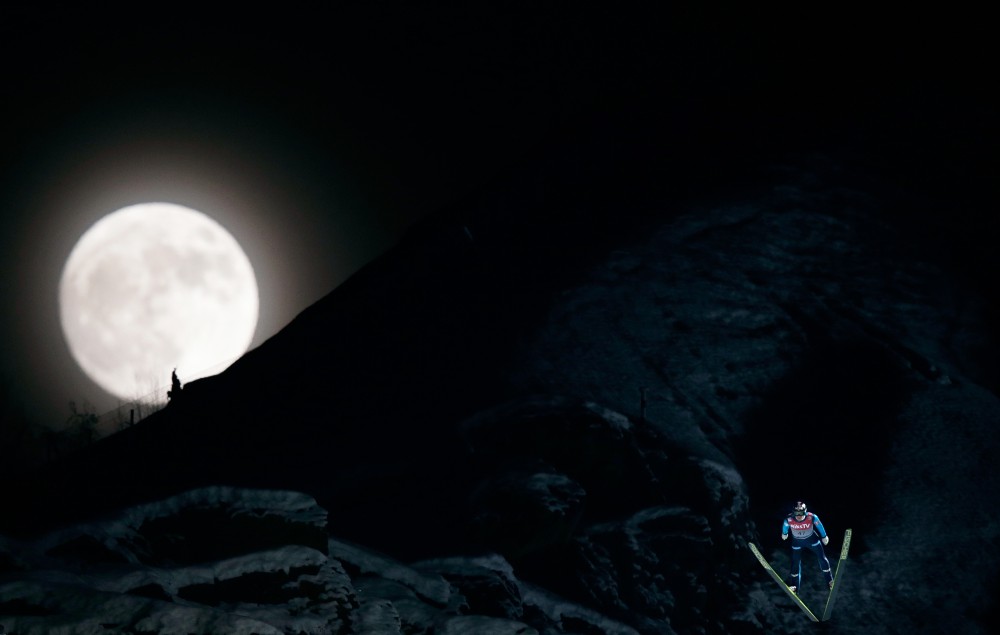 Norway’s Anders Bardal jumps during the FIS Ski Flying World Cup in Vikersund, Norway on January 25, 2013, while a full moon rises over the mountain.