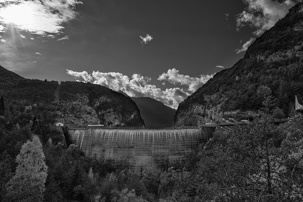 the valley, crashing inside the artificial lake. The water forms a 250m