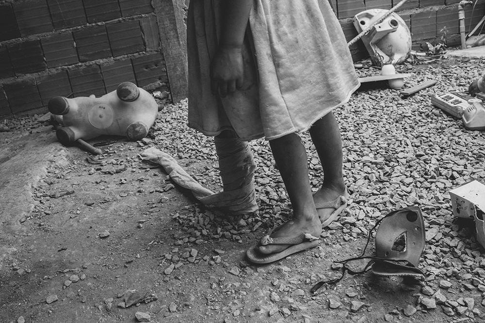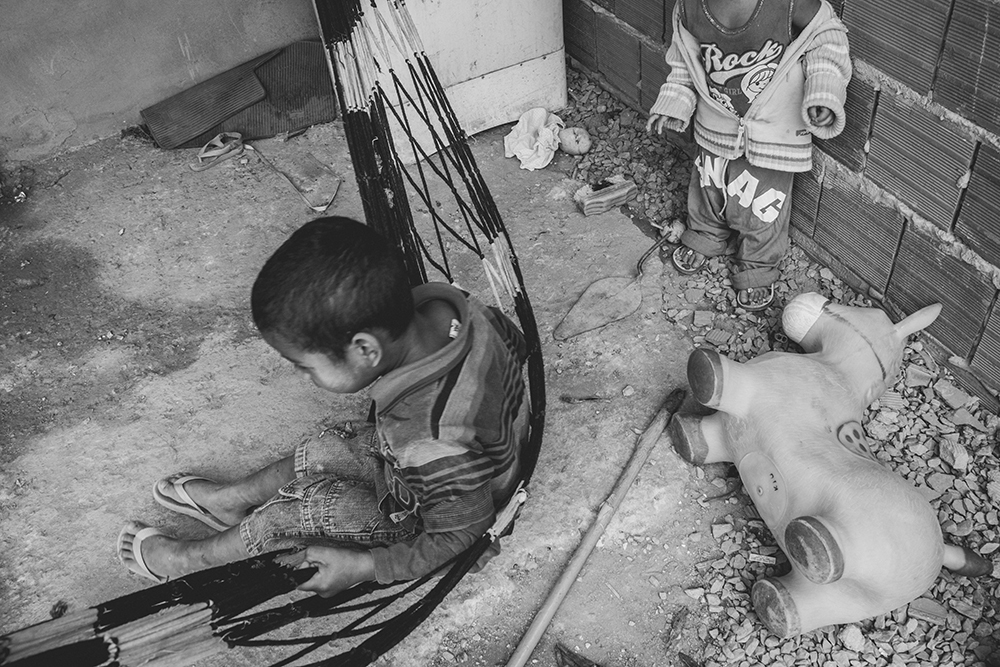 invention. For childhood at Sol Nascente, stones are characters, cans are stories and dust is party. This series tells about the routine of children living at one of the largest slums in Brazil and Latin America, Sol Nascente, where only 2.95% of the population has completed higher education and more than 6,000 children under age 6 are out of school. Accompanying volunteers dedicated to improving the quality of life of its residents, I had known a reality that, although full of difficulties and challenges, is also full of hope. And it is precisely the puerile hopes that protect children from real life through imagination. Thanks to these hopes, children live their perfect world: colorful, loving, complete, worthy.