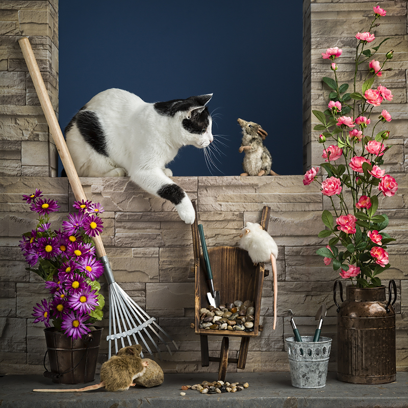 A whimsical portrait of a cat interacting with a mouse in a garden