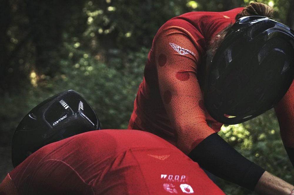 A series of two mountain bike pilots in their fashion gear touring in a wonderful green