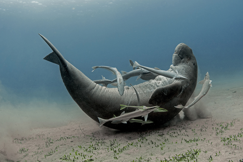 On almost all occasions the dugong was surrounded by remora suckerfish as it searched