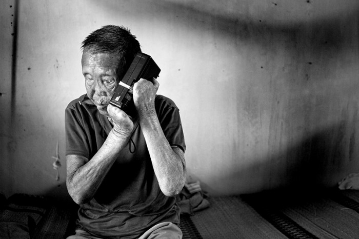Bop, 68, sits on his bed and listens to his broken radio for world news which comes on every evening at 5:30PM. At the age of 6 he contracted Leprosy and his family brought him to the Van Mon Leprosy Village near Thai Binh City in Northern Vietnam. He comes from a farmer?s family and has always wanted to know more about the world outside Van Mon. His radio is his only connection to that world. He has lived at Van Mon for his entire life. Even though Bop has lost both of his eyes, all of his fingers and toes to the disease, he still manages to take care of himself with little or no help. Twice a day he walks 1km to church to pray. When asked why he goes to church so much he said, "I have this disease (leprosy). If in this life I don?t have something to believe in for my next life, then I have nothing, except that I?m unlucky. My life now has become meaningless. I don?t care anymore about my life now or dream about anything in this life. So now I am living and praying, looking forward to the next life."