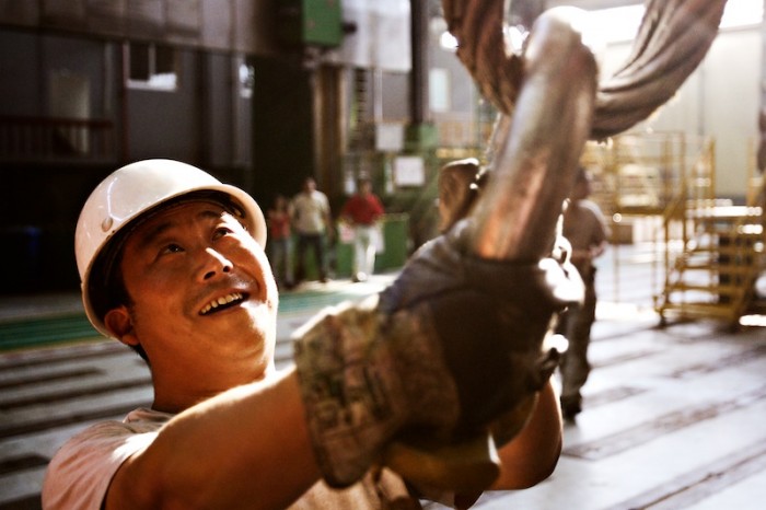 A factory worker smiles at the end of a long and productive week. Promotional image for an industrial manufacturer. Taken on location in Beijing, China.