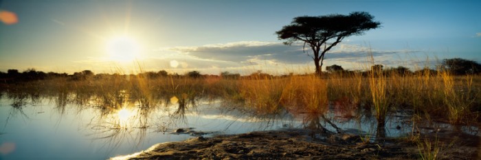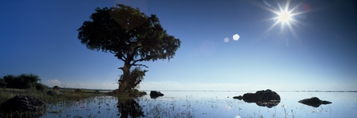 1: This was shot when the Chobe River in Botswana?s banks overflowed. A few months later there was only grass here. It was very still and as there was a crocodile 4m away I had to drive the car into the water, which came up to the doors. In order to avoid any ripples, I had to keep very still, trying to achieve that perfect calm I was looking for. I shot this straight against the light source using a grey filter (4 stop) to compensate for the bright sun. 8 reflector boards were also used to reflect the light back onto the tree to avoid it becoming a silhouette. I also shot this when the sun was lower but the stark blue of the sky that can be noted here disappeared.
