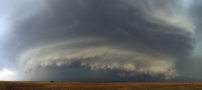 A tornadic supercell thunderstorm rotates over north-central Kansas on May 29, 2008. The severe cell produced multiple tornadoes.