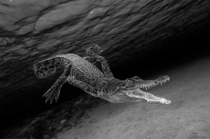 A juvenile salt-water crocodile opens its jaws underwater in a threat display.