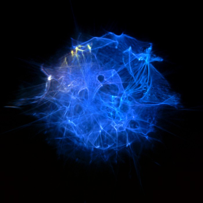 A complex refraction pattern of a beam of light passing through a piece of formed plastic. Coloured dyes have been added to the hardening plastic which increase its complexity. The refraction pattern is captured directly on to colour reversal film as a colour 'photogram'.