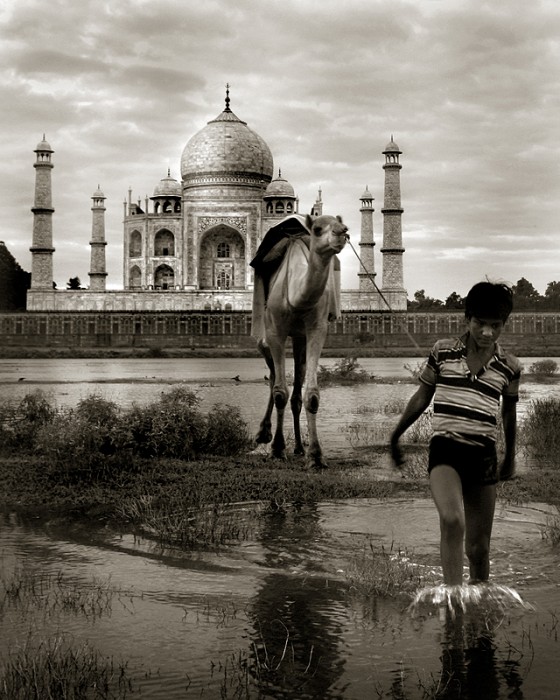 A boy and his camel coming out of the river behind Taj Mahal.