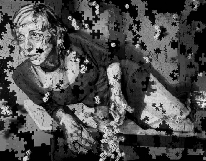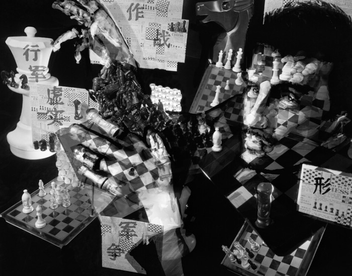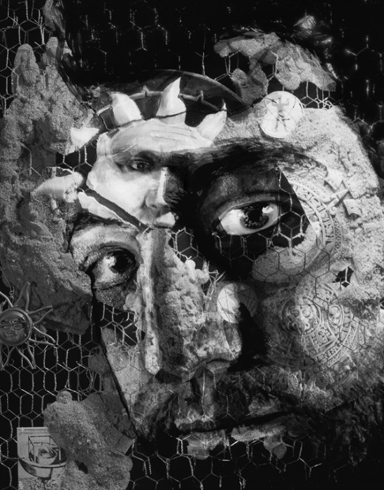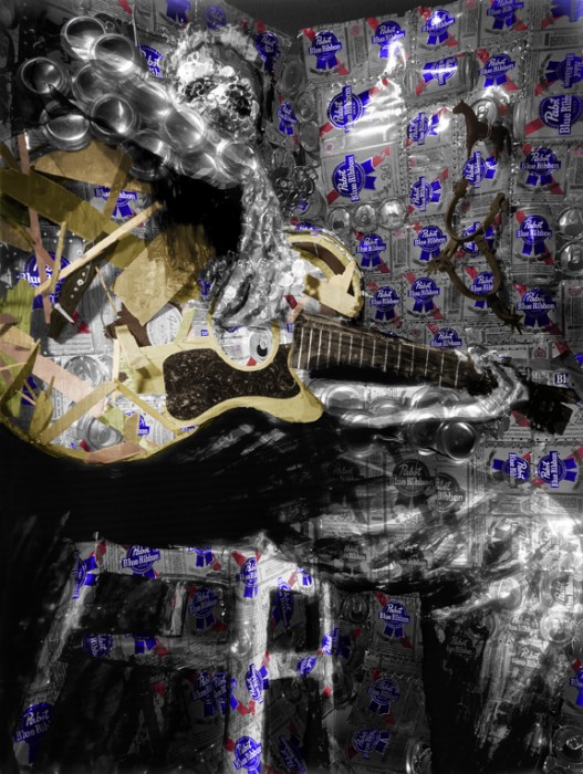 10+ Exposures on large format film. Images are hand made sculpture photographed through a succession of hand painted overlays to create the effect.