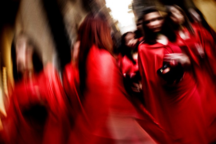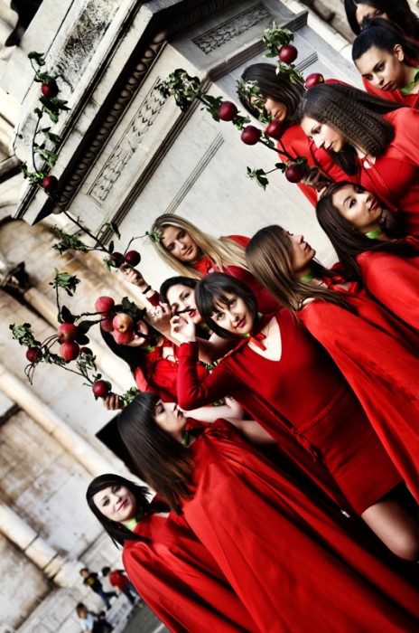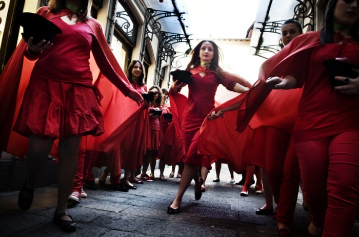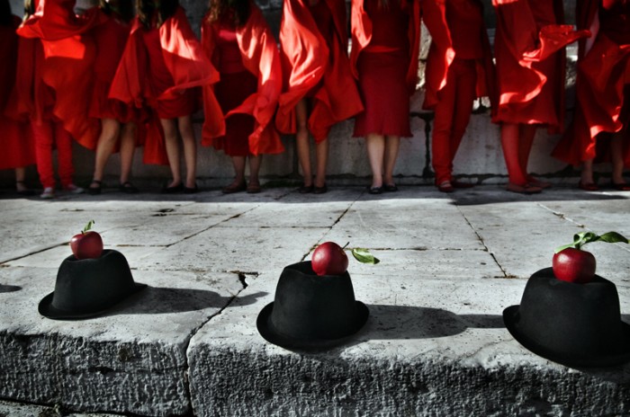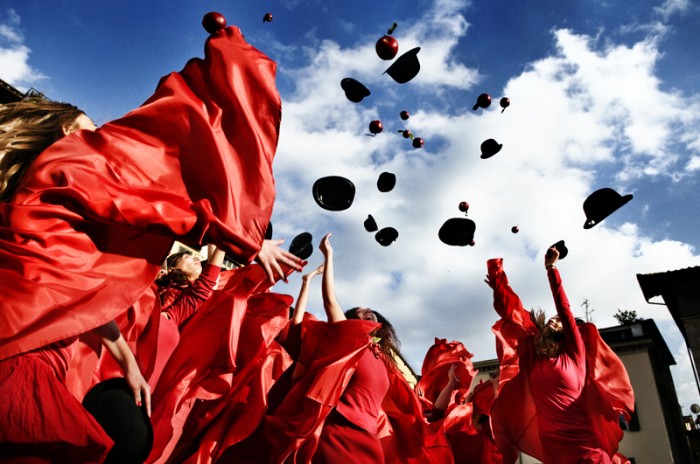 This is a performance photo live for the Lu.C.C.A. Museum of Contemporary Art which has been opened on may 9th 2009 To represent the Museum (which has the apple as logo) and the contemporary art, I directed 20 girls, red dressed with some apples in a â??Magritteâ?? hat, walking rounds the city of Lucca, on april 24 2009. I wanted to give to the people the sensation that something was going to happen and that it was easy to switch â??Living The Appleâ?? in â??Living the Muuseumâ?? or in â??Living the Artâ??.