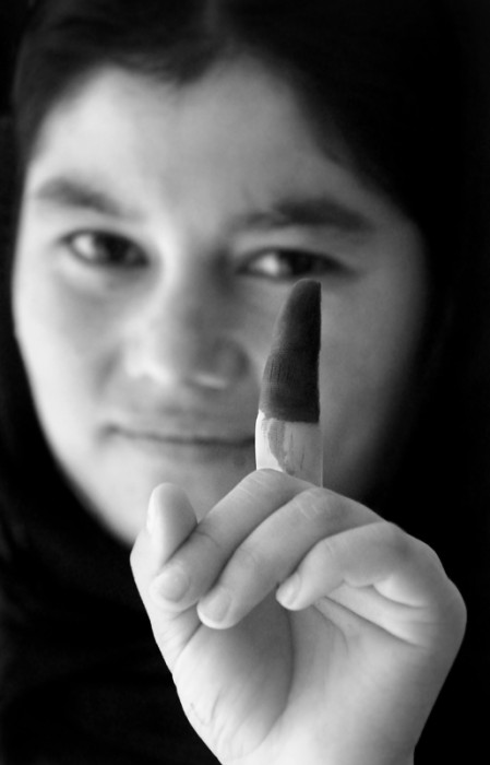 An Afghan woman with an inked finger after voting for her first time in Lashkar Gah, Helmand Province, Afghanistan. Many Afghans went to vote in the elections despite the Taliban using violence in an attempt to disrupt them.