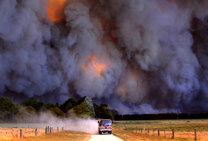 A fire truck escapes a blaze that claims the lives of nearly 200 people in Victoria, Australia.