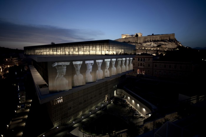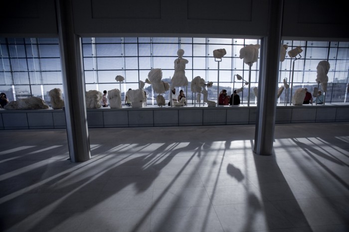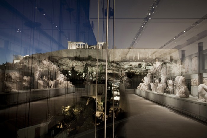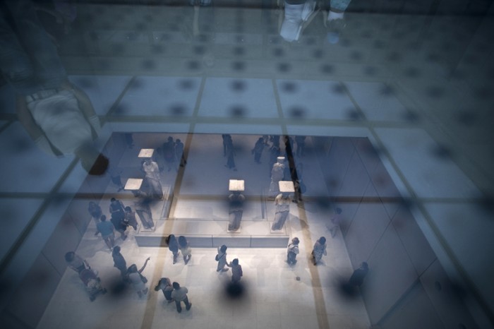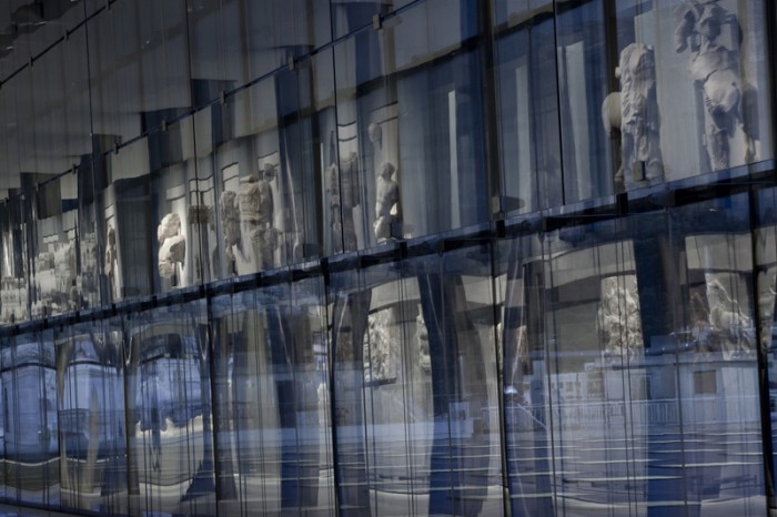 The new Acropolis museum was welcomed with great joy and pride by the greek people, not least because it seemed like a perfect way to tell the world (and particularly the British) â??weâ??re ready, give us back the Parthenon marblesâ??. The building, opened to the public in June 2009 spans over 14.000 square meters and exhibits almost 4.000 objects. Its transparent design â?? even the floors are made partly or entirely from glass â?? allows both the sunlight to come in and bring out the exhibits in all their glory, but also to tie the visitorâ??s eye to the surroundings of the Museum, namely the Parthenon that hangs over it. But this is not the whole story: with many of the original objects exhibited in various museums around the world (and most importantly, the Parthenon marbles in the British museum), there was a need for replication for many of them. This is what the current photo set conveys: the connection of the original monument to the objects exhibited due to the museum design, but also a contrast between the original and the replicated, the present and the missing, the truth and the illusion. General view of the museum which is based right under the Parthenon.