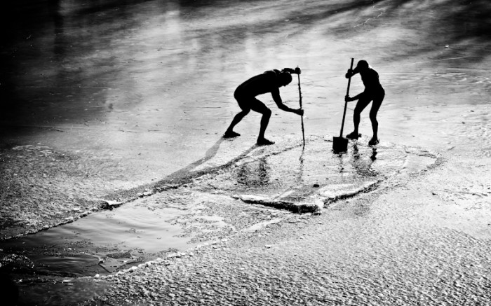 Chinese winter swimmer, breaking ice, for their swimming pool