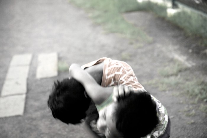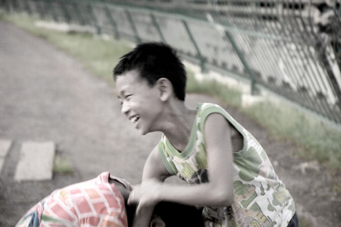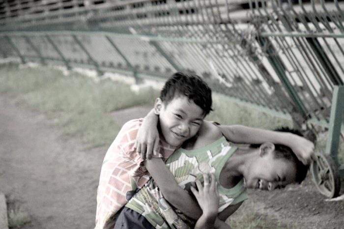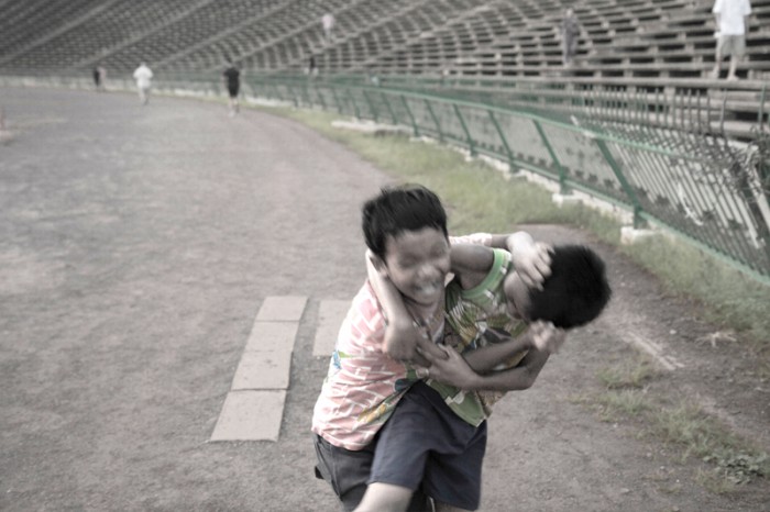 Phnom Penh, Cambodia. Every evening before it becomes dark the inhabitants meet in the Olympic Stadium and do sports which can be challenging due to the climate. Young, old, female, male - everybody. Long distance runs, aerobic lessons, basketball, soccer. In between these two young friends running, playing, fighting ... obviousely they have fun .. and probably will sleep well this night well.