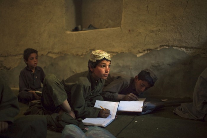 Helmand, Afghanistan - June 12, 2010: Afghan boys study in a makeshift school house inside a US Forward Operating Base in the town of Dahaneh in Helmand Province.