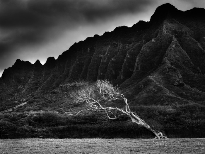 Taken on a small island of Oahu, Hawaii, this landscape photograph print portrayed an overpowering mountain that seemed to watch over you from behind a weak tree. I spent long hours composing the image, appreciating the texture provided by the trees, and I hoped to capture the vibrant energy of the place.